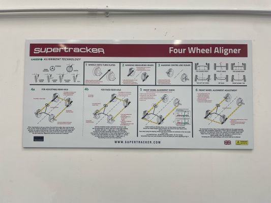 Handy wall panel which provides instructions as to how to conduct a wheel alignment with the Supertracker STR1 laser wheel alignment system.